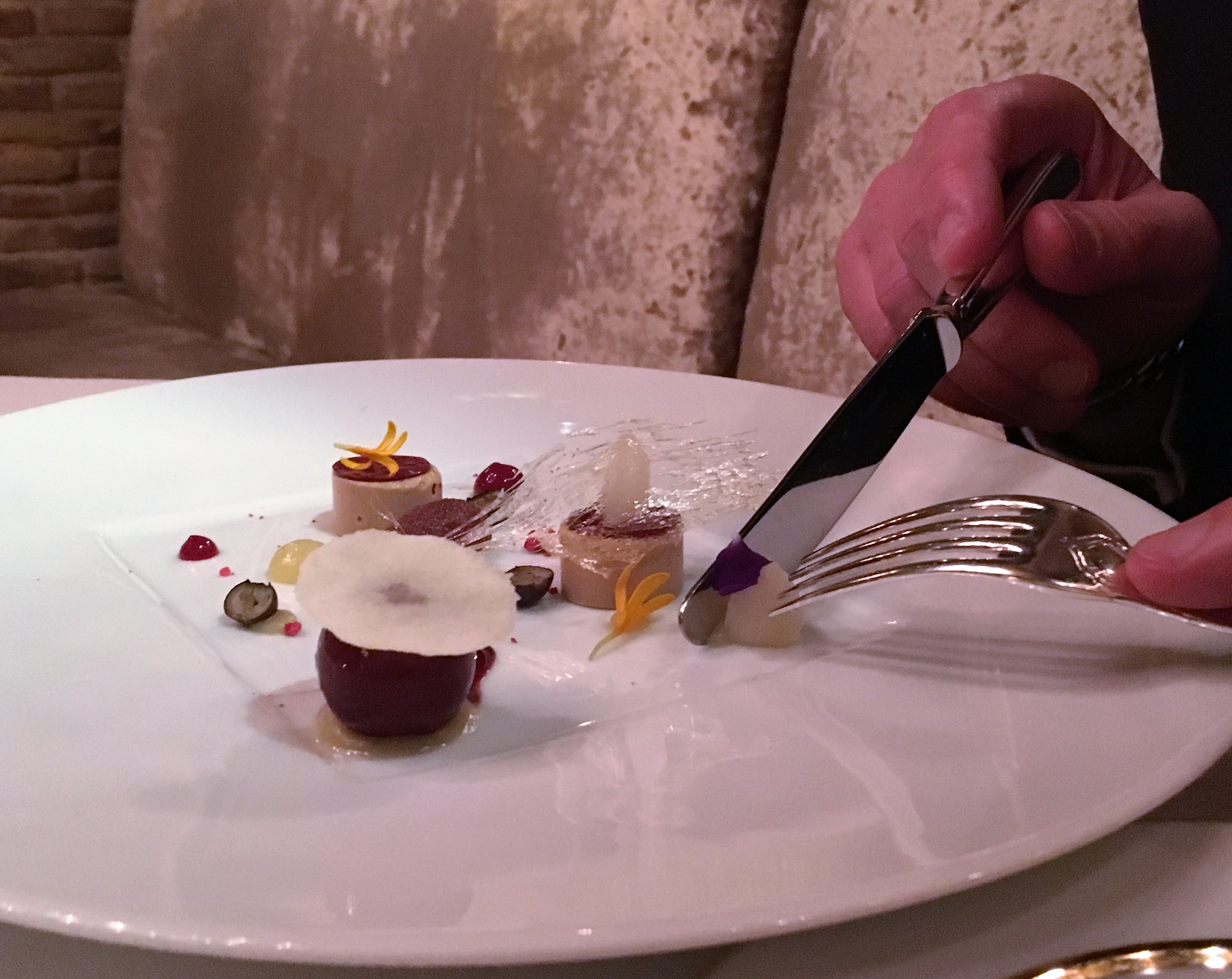 Two Michelin Star Spondi in Athens was a very special affair. It was our first Valentine’s Day meal out as we just happened to be in Athens at the time. A beautiful restaurant setting for a romantic meal with vaulted ceilings and open brickwork added to the ambience of being in the Greek capital as well as an exquisite kitchen run by chef, Angelos Lantos. The seven-course vegetarian menu was unexpected for Greece but beautifully presented and totally memorable with a tour of the impressive kitchen to start the evening.