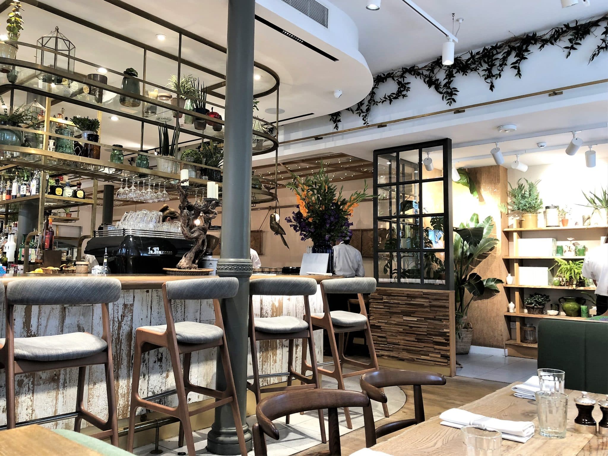 The rest of the interiors comprise of a palette of earth neutral greens, whites and wooden accents in the form of tables and chairs with the addition of large white pots containing lush green plants. The restaurant also has an open kitchen, delivering an added theatrical performance to gaze at whilst awaiting your food. The high ceilings, huge windows, which provides the opportunity for natural bright light flooding in and side intimate booths with open floor seating makes this place classy, cool and bang on trend but also gives it the upmarket feel in keeping with the neighbourhood.