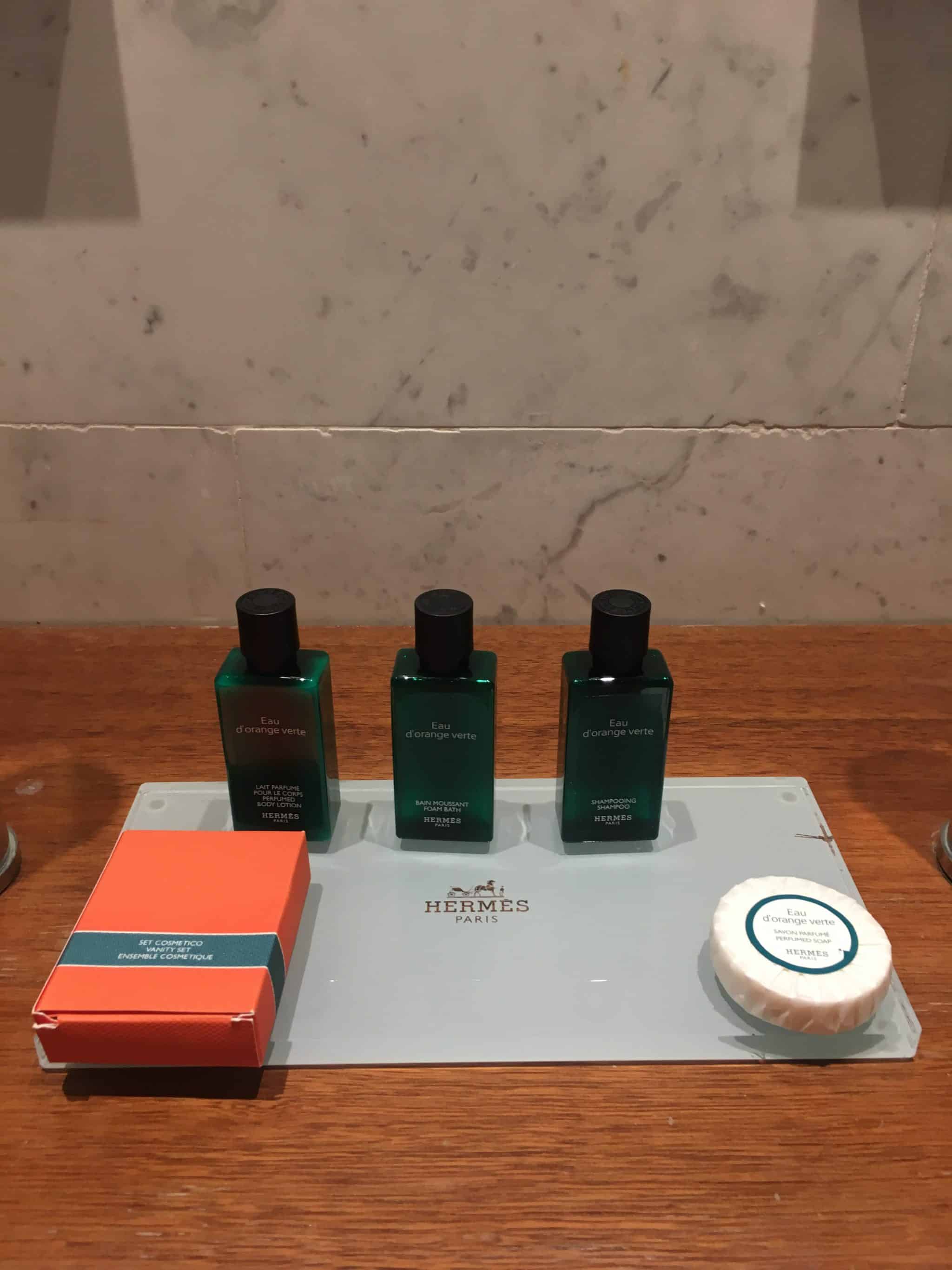 Bathrooms are luxuriously equipped with amenities from the Hermès brand and contain double vanity units with separate shower rooms and a freestanding bath.
