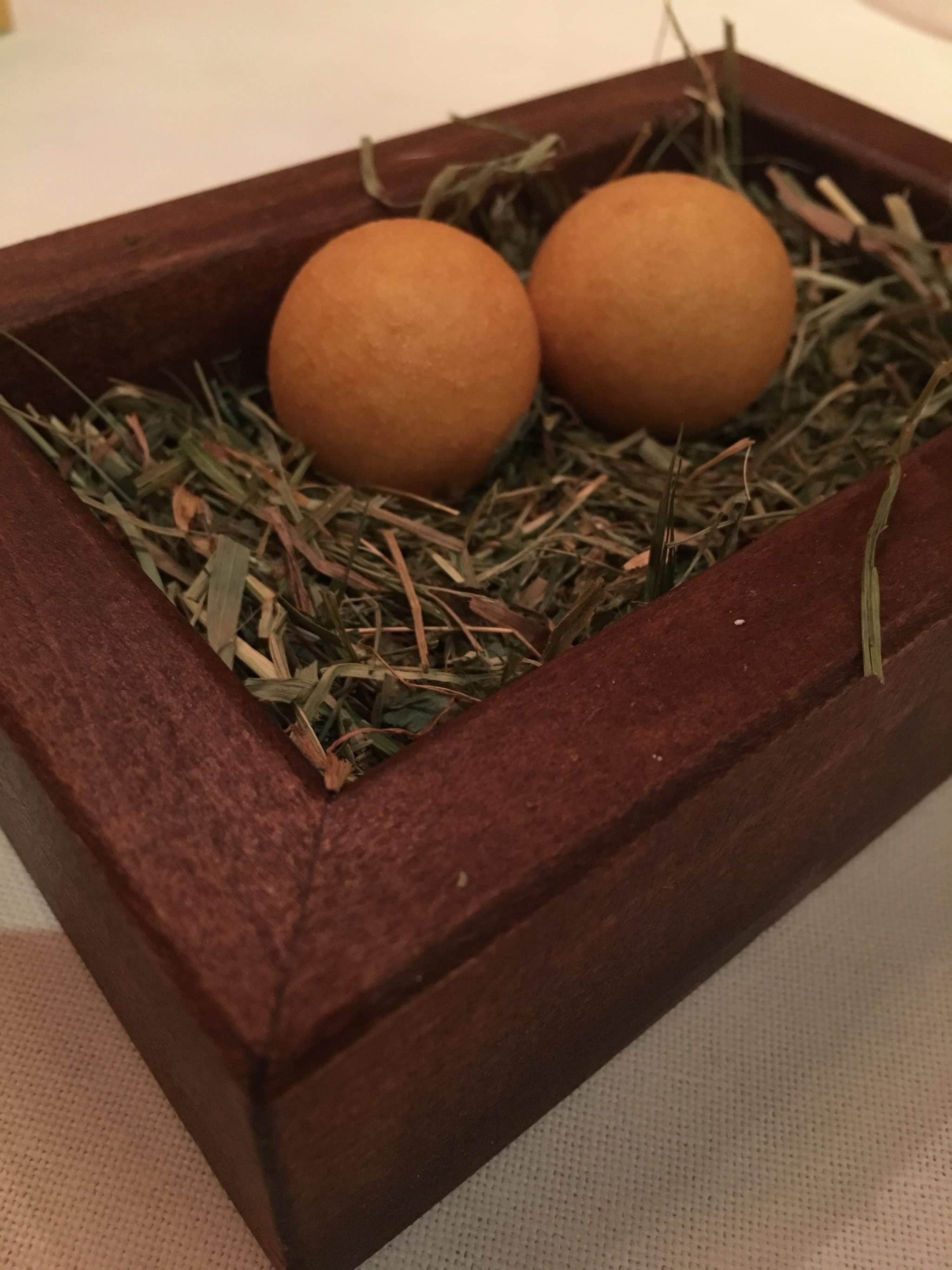 This was swiftly followed by a brown oblong box containing two small spherical shapes resembling croquettes. They were laid over some green bedding, which gave the illusion almost of a nest upon, which sat freshly laid eggs. These croquette balls infact contained a concoction of the most divine taste of smoked milk that was truly a taste sensation I have never experienced before. What do they say, the best things come in small packages! Certainly true in this case.