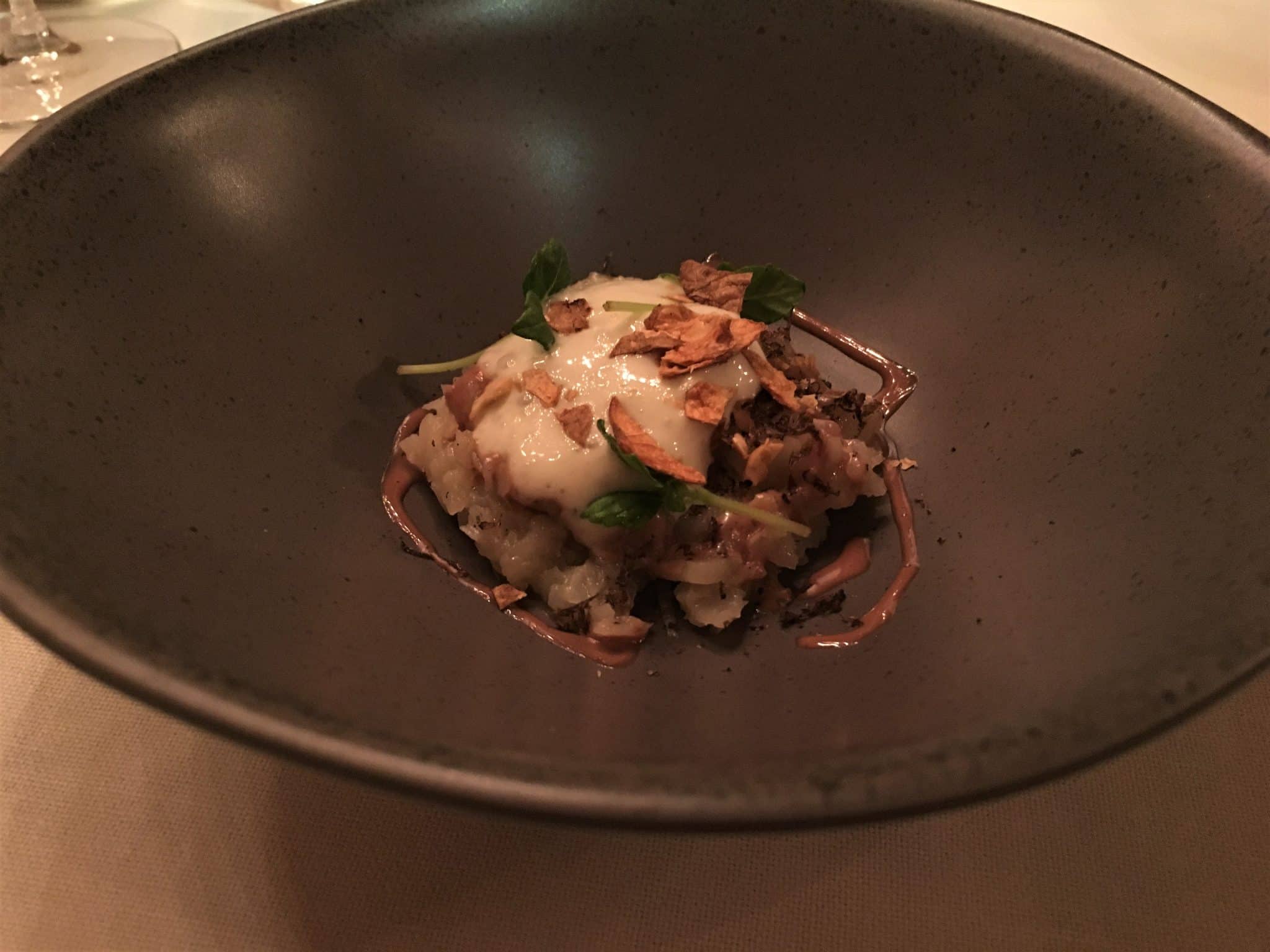 Not being the greatest fan of artichokes, I was eager to try this dish but I needn’t have worried as I am converted! This was served almost like a chopped salad in a beautiful black dish which enhanced the aesthetics of the cuisine. The Jerusalem artichoke was mixed with the most divine truffle and a beautifully creamy variety of goats cheese originating from France called Saint Maure. The cheese is produced in the province of Touraine in France, situated in Indre-et-Loire.