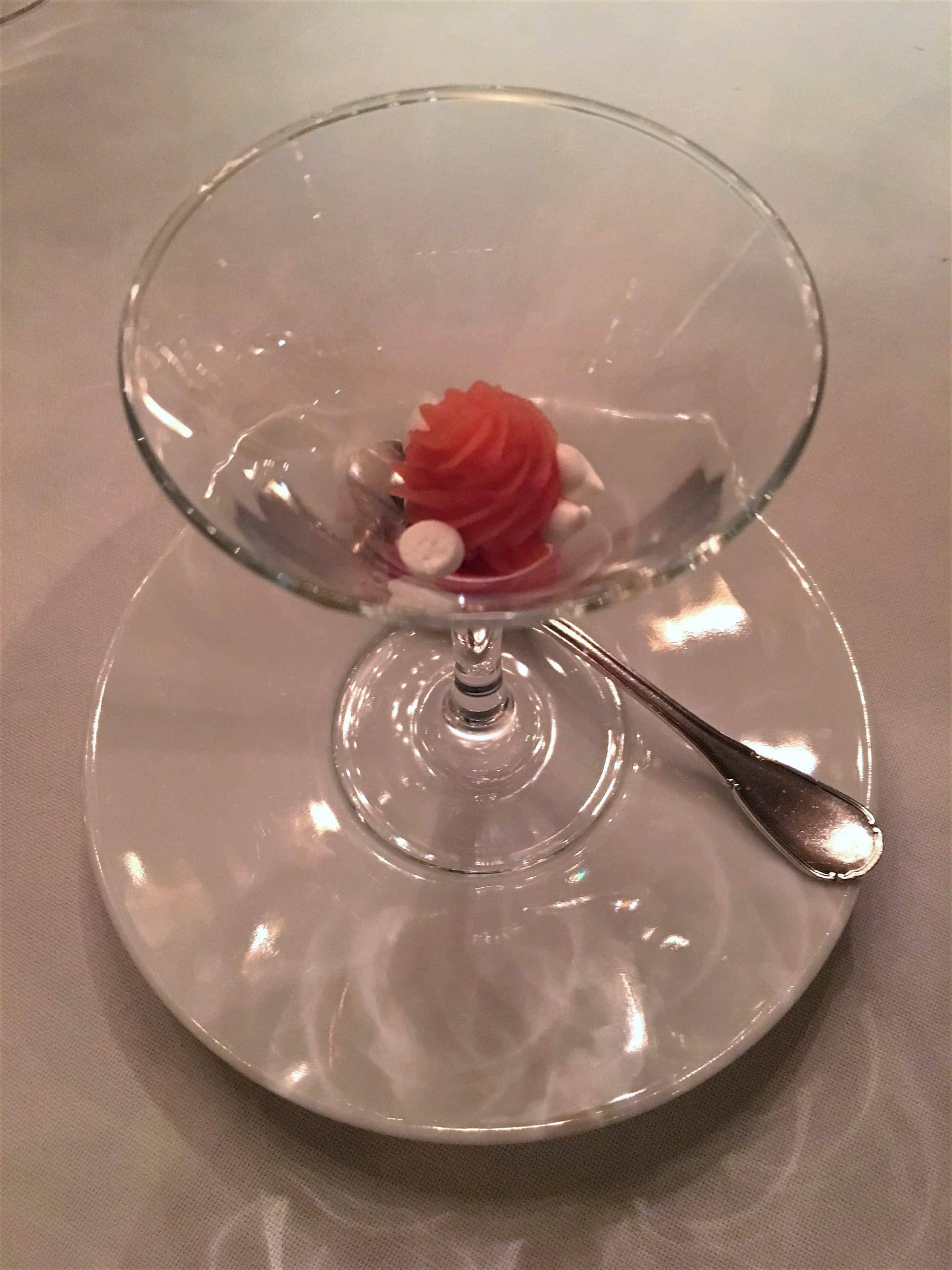 Elegant dining at 2 Michelin Star Spondi in Athens Orange, ginger and meringue palette cleanser