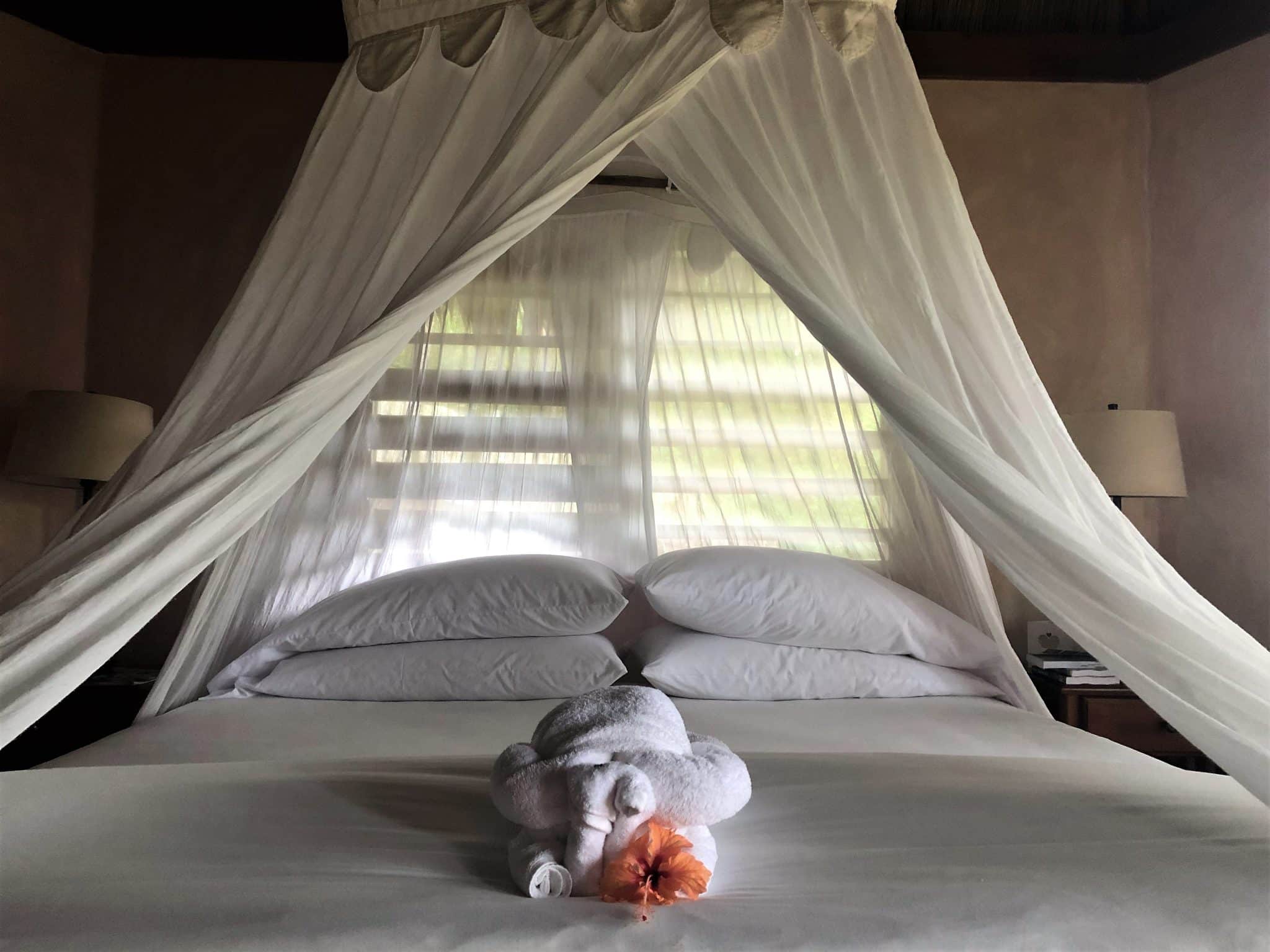 Our king bed was draped in mosquito nets, which are let down and prepared for you during the lodges evening turn-down service.