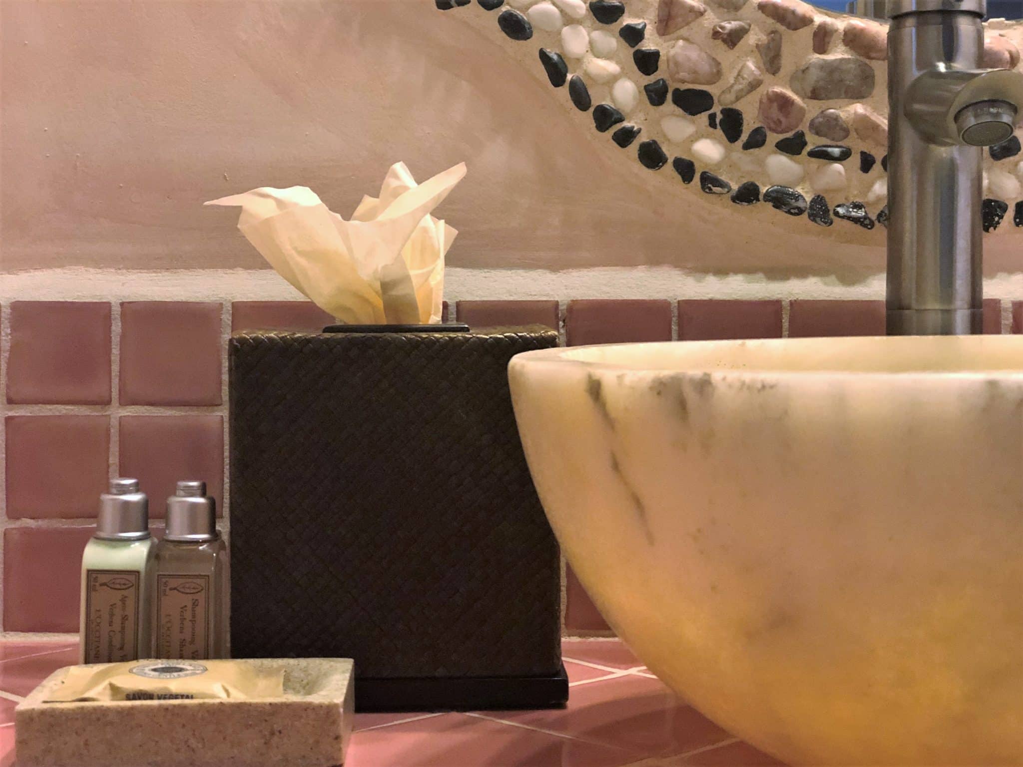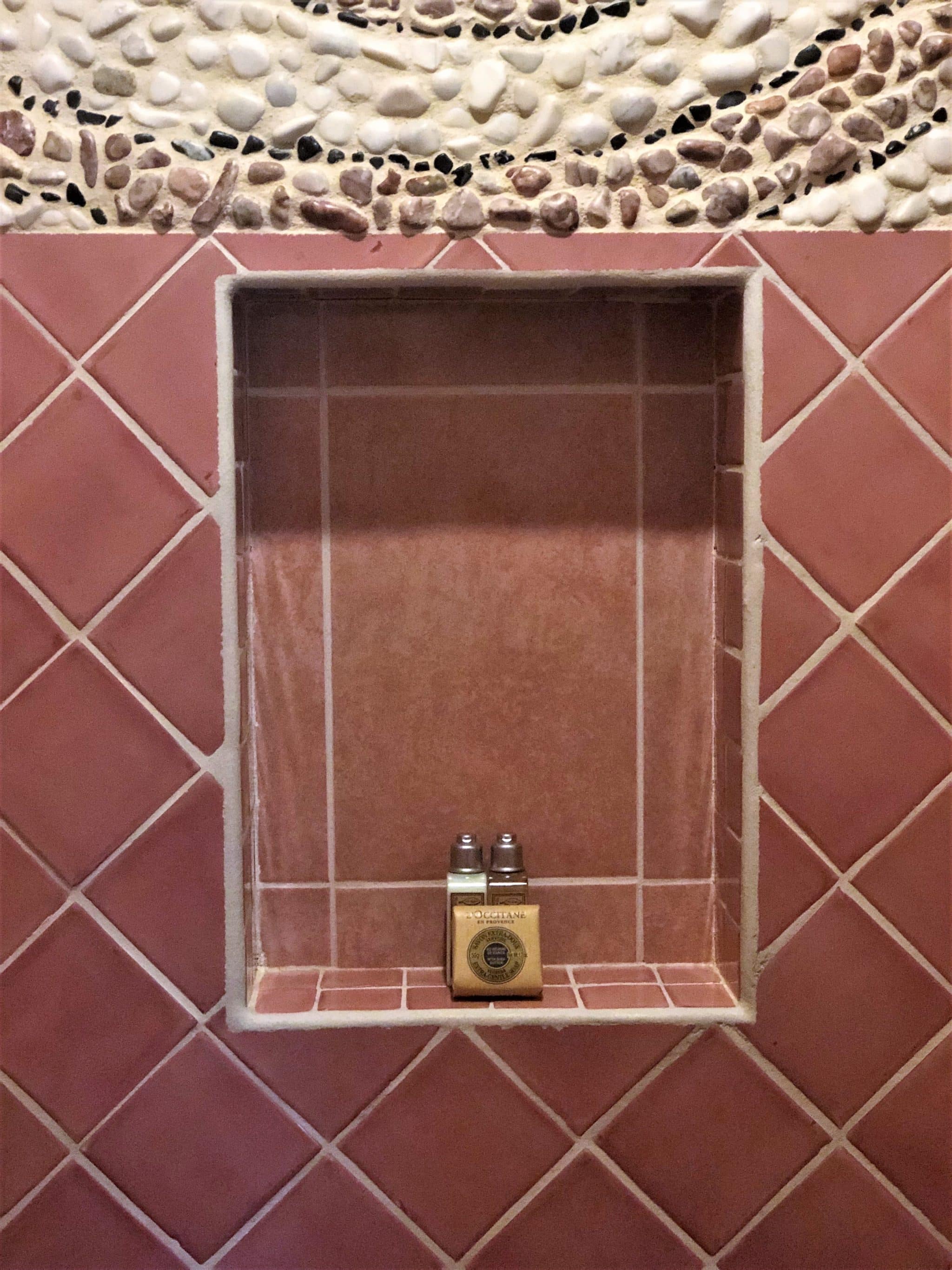 The bathrooms are small but perfectly formed, decorated in dusky pink tiles and stocked with L’Occitane products.