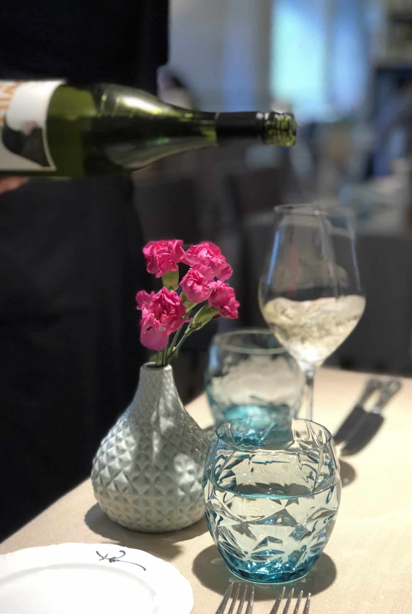 Vegetarian-friendly food in Riga: A glass of white wine at Domini Canes Restaurant, Riga