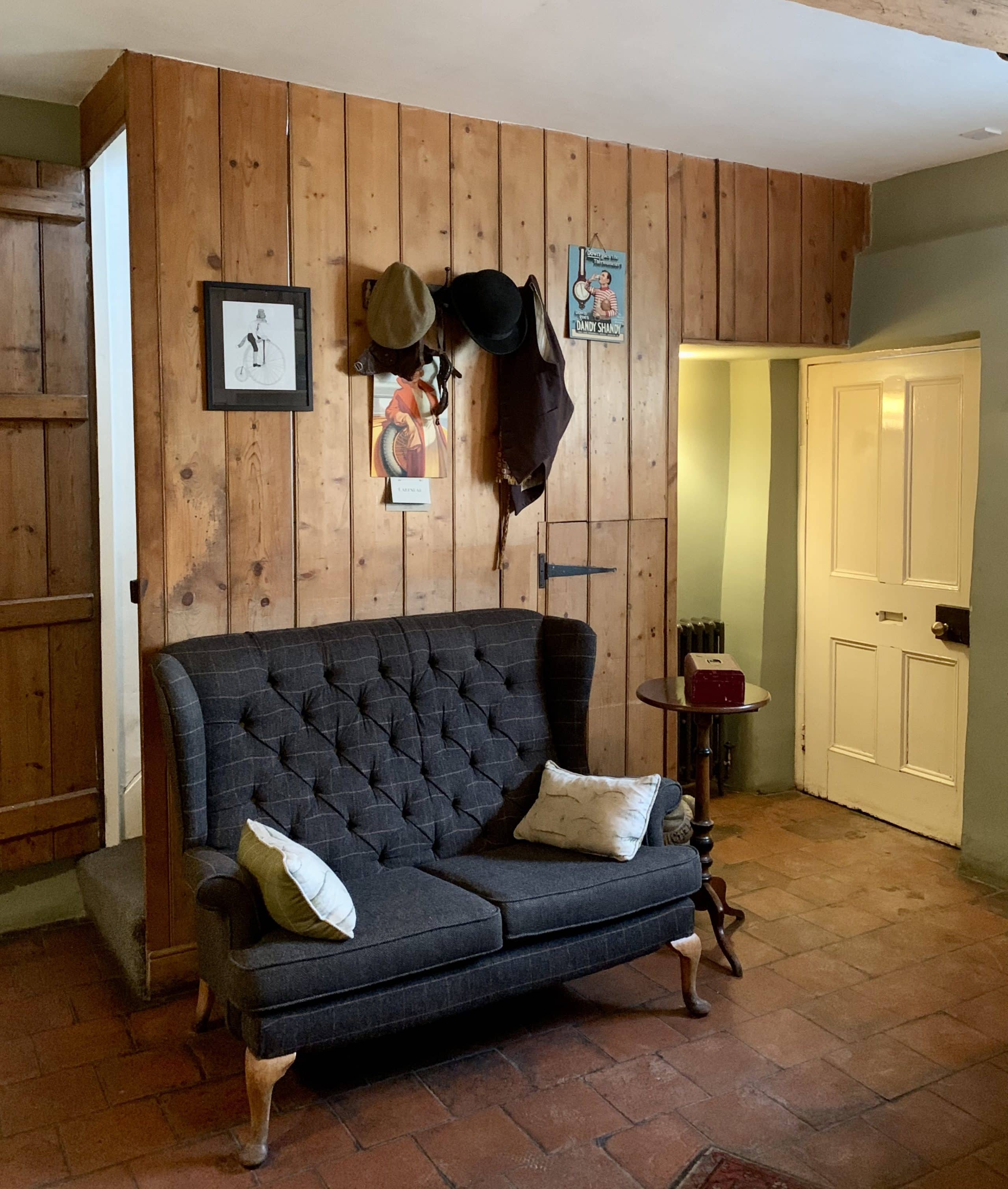 Michelin Star dining at John's House in Leicestershire: a navy blue 2 seat sofa in the lounge area with a wooden panelled wall.