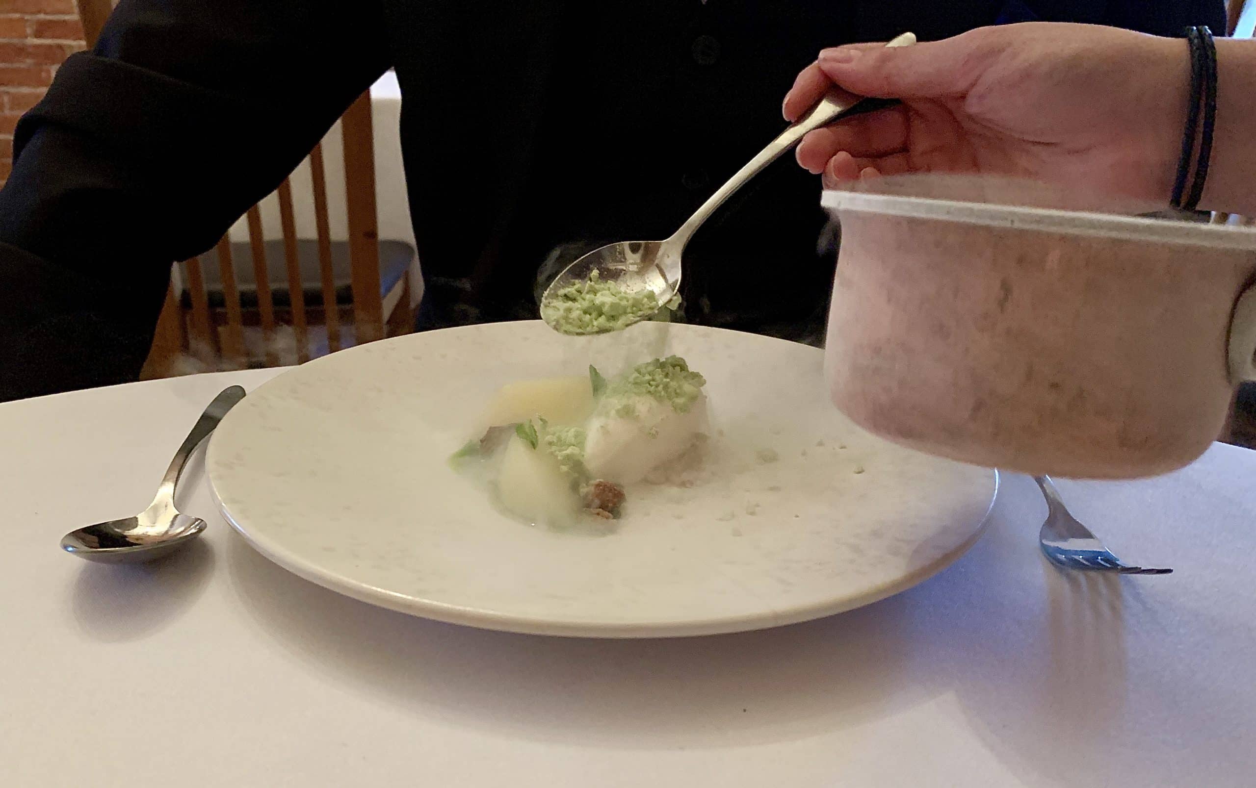 • Course 8: Poached Pears, Liquorice, Sweet Cheese, Mint and Hazelnut