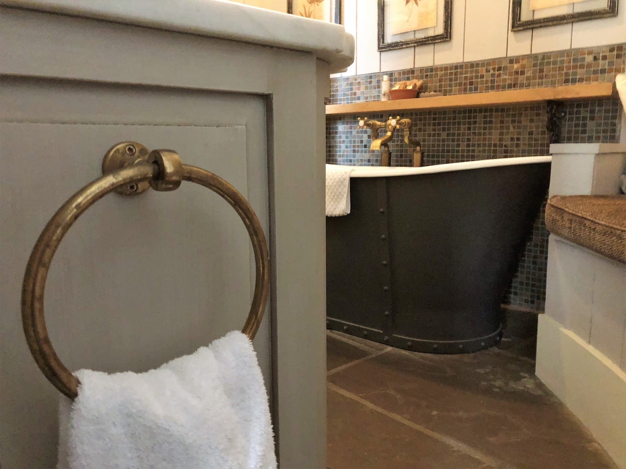 You enter via the cute bedroom containing all the necessities you would ever need and this compact rotunda houses double sinks, a roll top bath facing a fire (oh yes you can have the most cosiest of baths!), a double rain shower and amenities by the locally based Bramble.