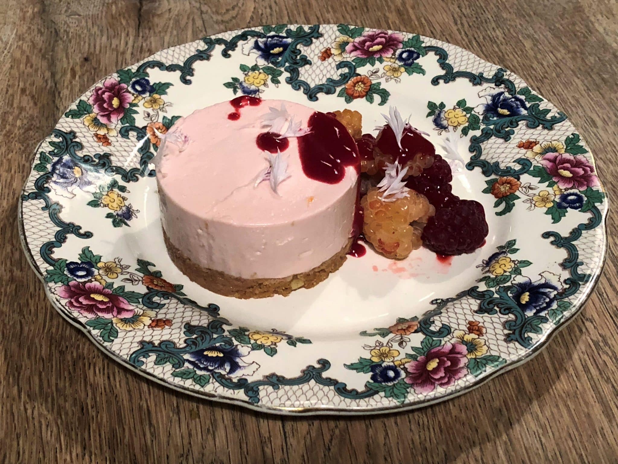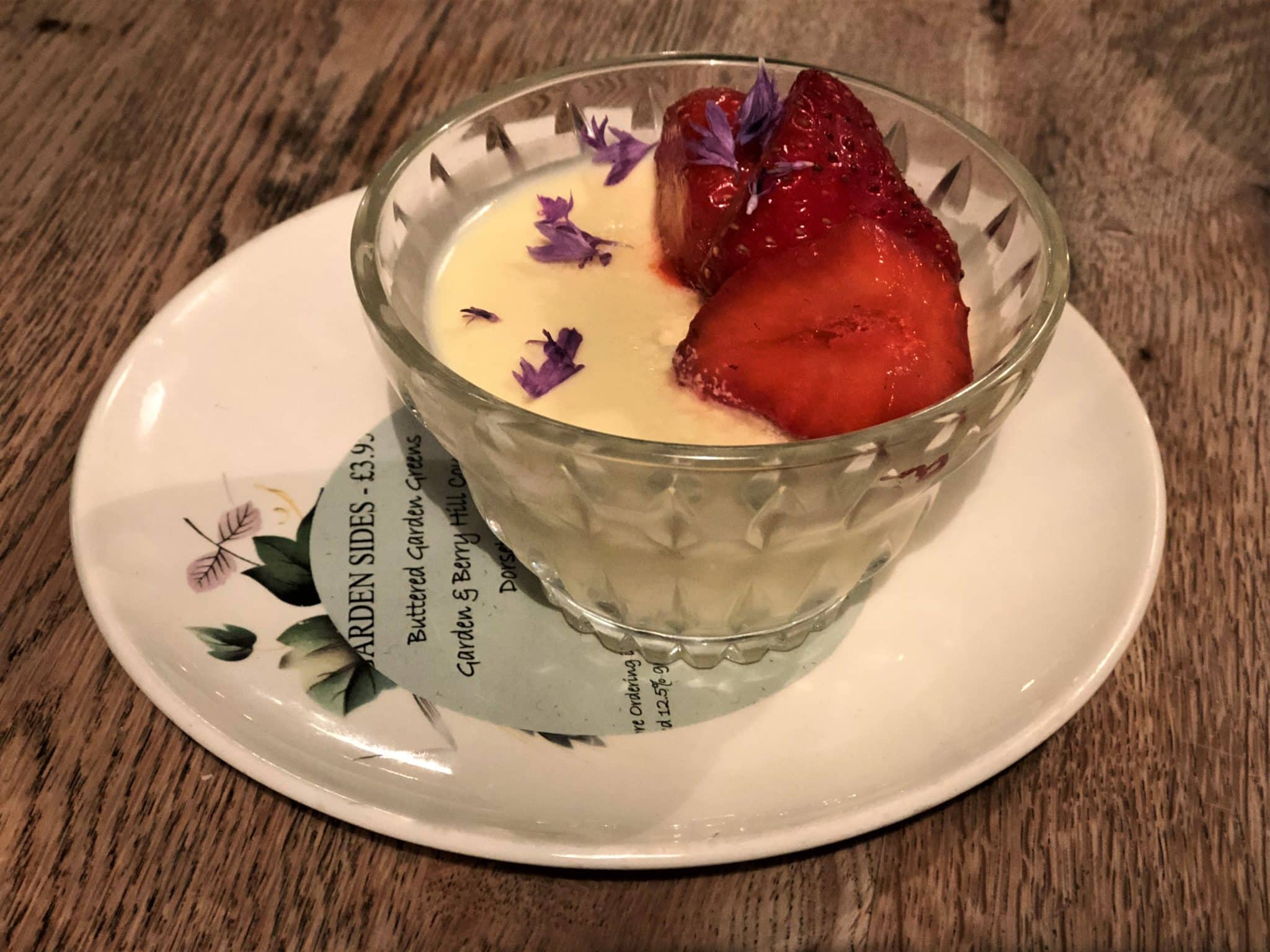 Unfortunately, I have no photos of our mains that evening as there was a power cut and candle light photography just didn’t work out but we enjoyed, a Bromham carrot salad with a nasturtium and elderflower dressing. Dr C had the wood roast Purbeck pork shoulder steak with Berryhill potatoes, apple and elderflower puree.The electricity did come back on in time for dessert, which was lemon verbena posset with forest strawberries and a raspberry cheesecake.