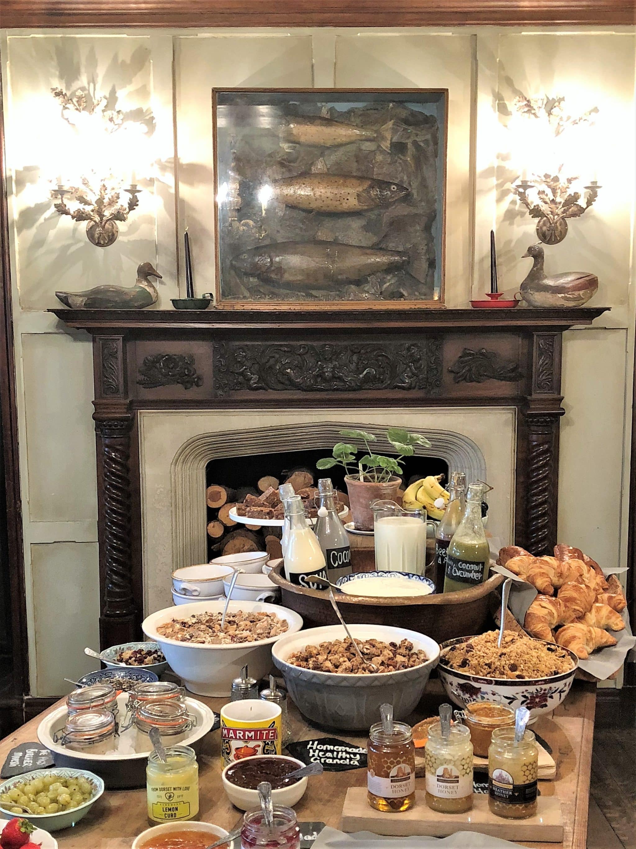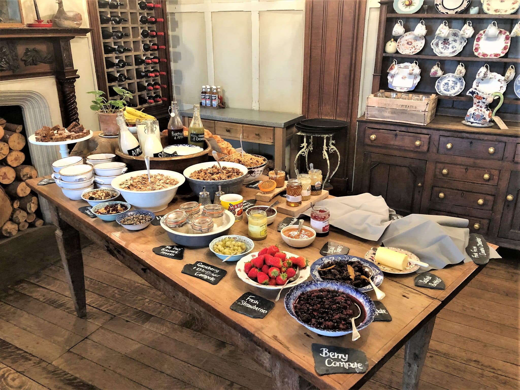 Breakfast was one of my favourites as The Pig’s version of a buffet is just a feast of colours and flavours for the eye. The freshly local produce is laid out on a large bare wood table surrounded by a beautiful dresses adorned with china and a fireplace filled with logs.