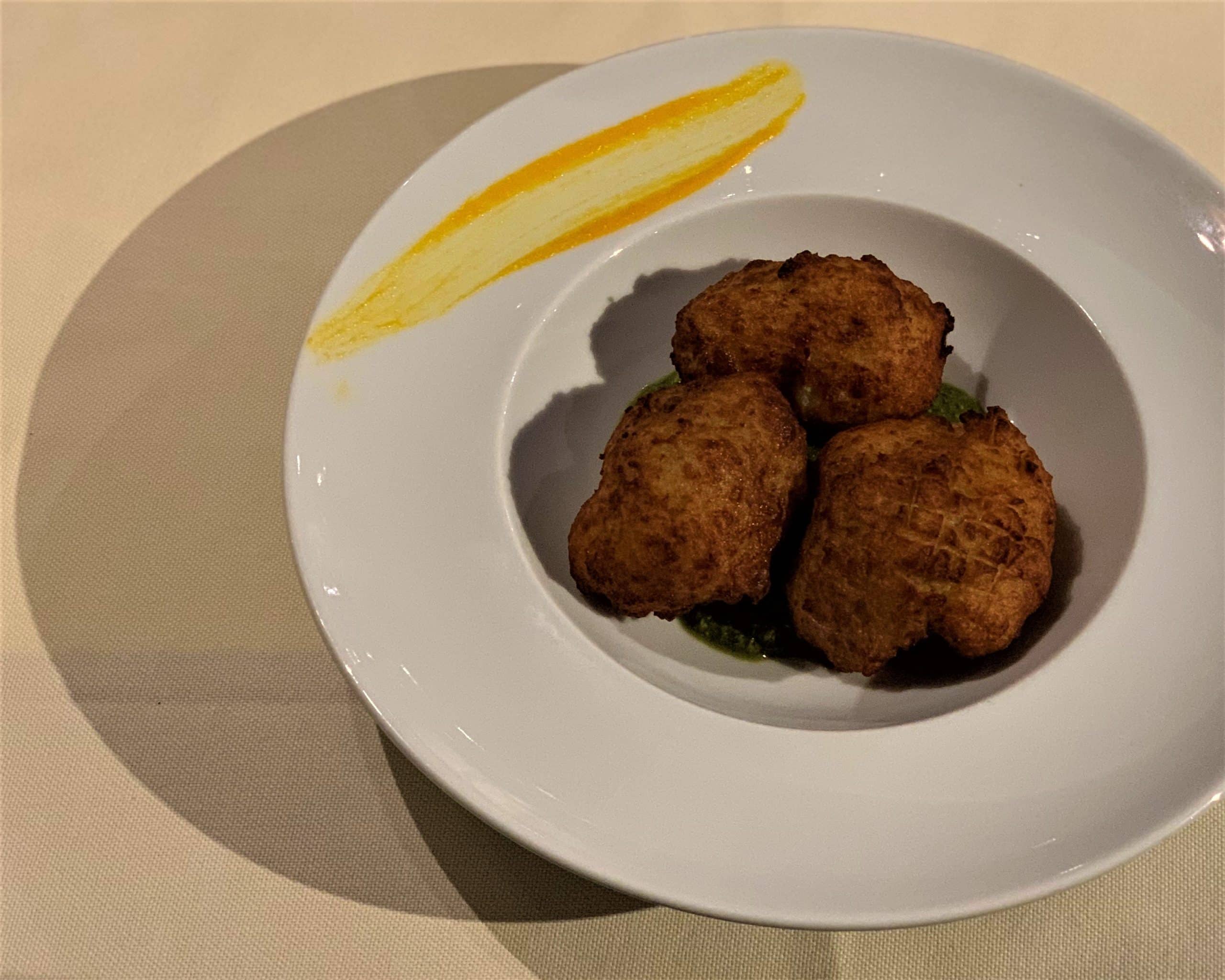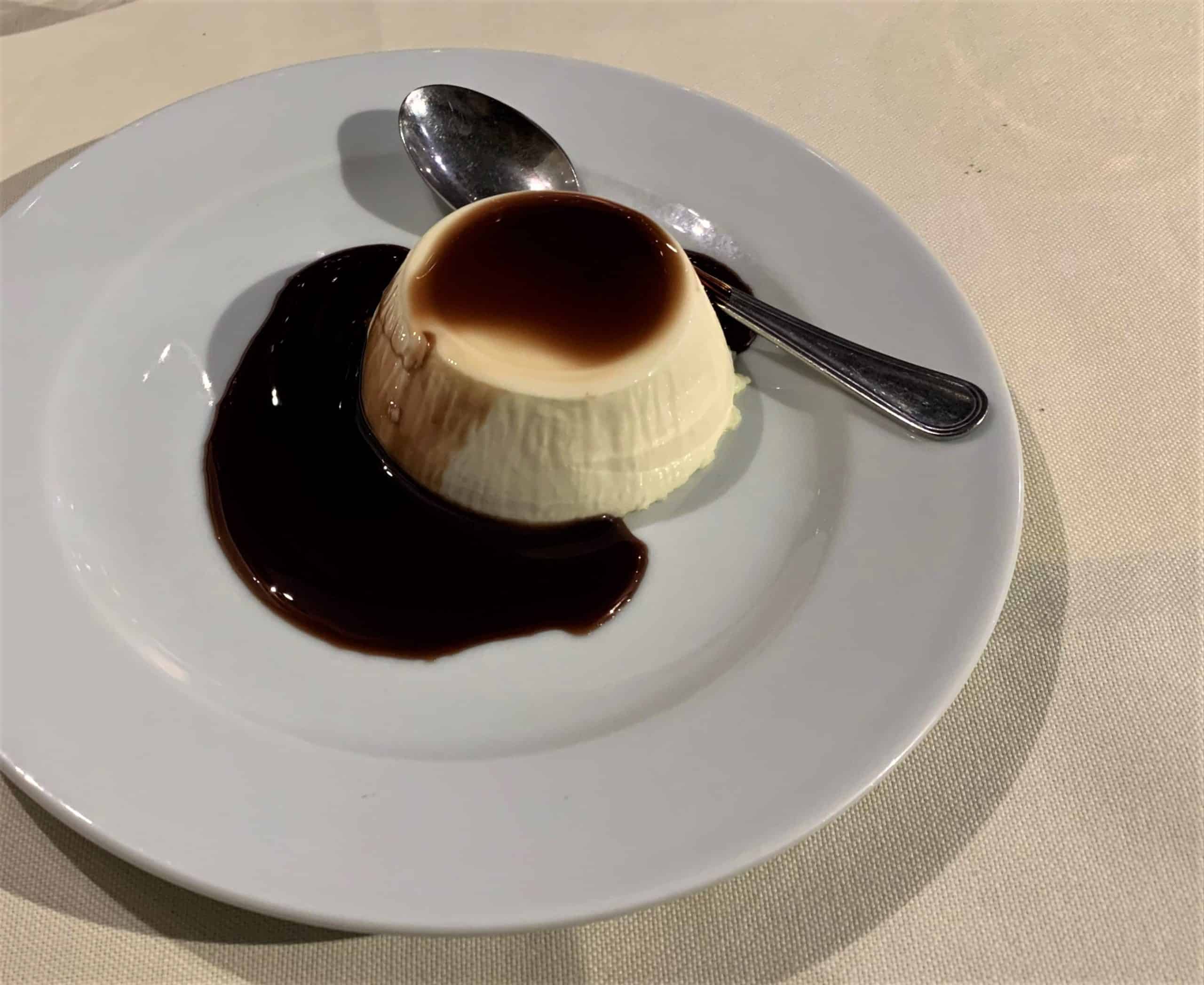 To start, it was pecorino cheese and potato croquettes, next a main of ravioli and to finish a panna cotta with a thick grape jus.