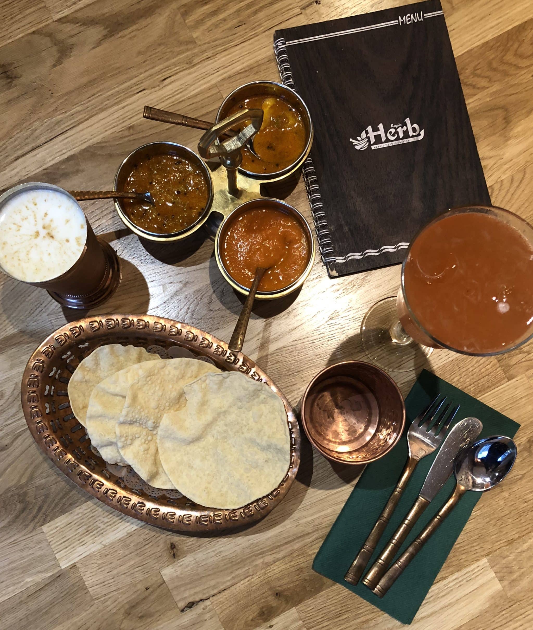 Vegetarian Keralan food at Herb Leicester, cutlery and menu with copper cup in the background